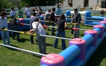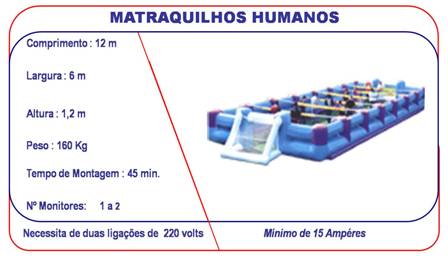 O popular jogo de matraquilhos transformado num insuflável gigante em que os bonecos dos matraquilhos somos nós. Cada equipa terá 6 jogadores.