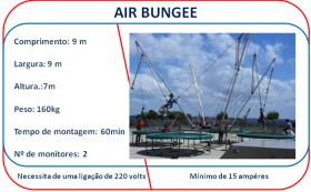 O Air Bungee é uma equipamento que permite a utilização de 4 participantes em simultâneo. Ideal para todas as faixas etárias. É bastante divertido e proporciona um grande fluxo de participantes. Utilização em eventos públicos, e privados. Também como parte de eventos escolares e de empresas.